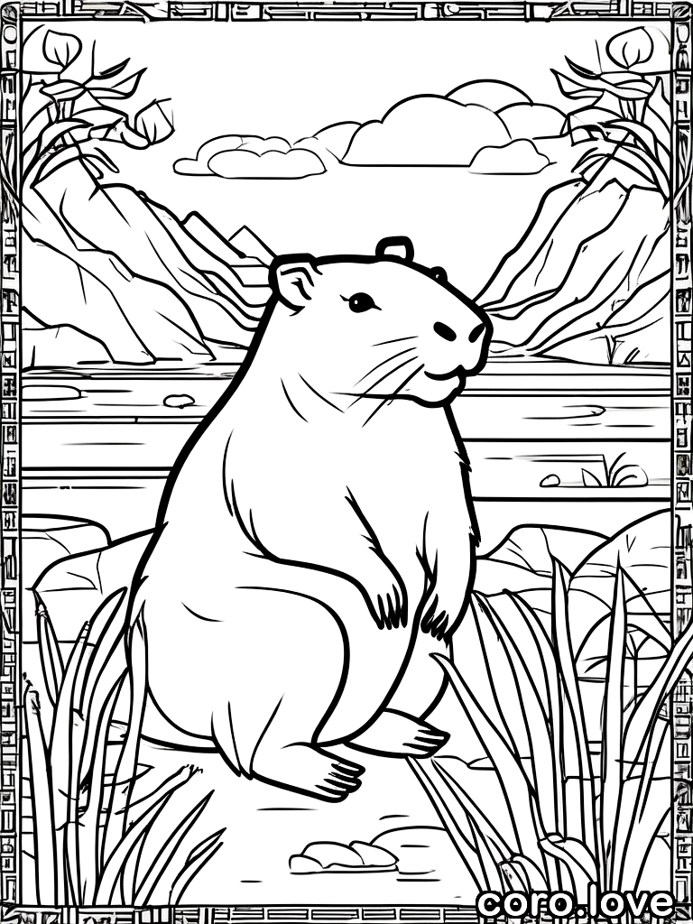 relaxing capybara, friendly, friendly face, content mood, miniature, line art coloring book, black outlines only, white background, no fill, no shading, outline drawing, contour lines, bold black lines, empty interior, wire frame style, simple linework, clean outlines