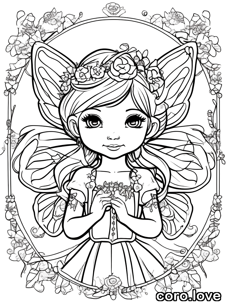 cute fairy, precious, happy expression, playful mood, miniature, line art coloring book, black outlines only, white background, no fill, no shading, outline drawing, contour lines, bold black lines, empty interior, wire frame style, simple linework, clean outlines