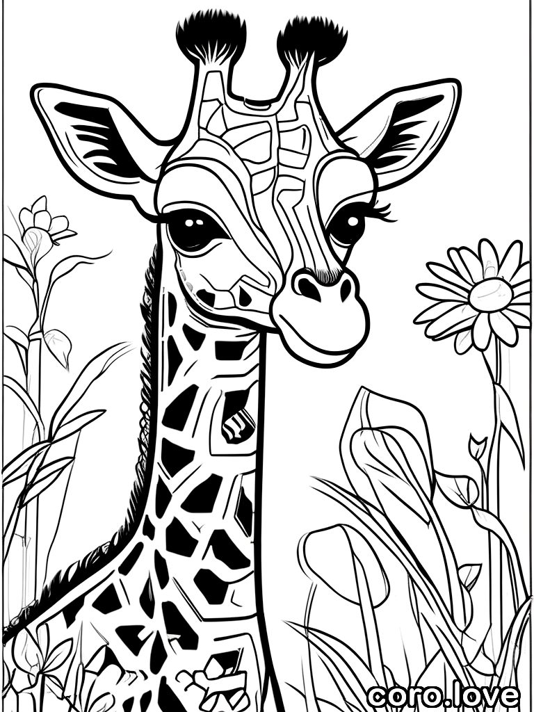 baby giraffe, cute style, cute face, playful mood, small, line art coloring book, black outlines only, white background, no fill, no shading, outline drawing, contour lines, bold black lines, empty interior, wire frame style, simple linework, clean outlines
